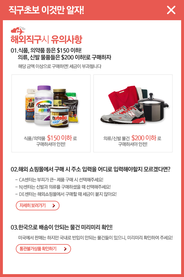 미국에서 직구한 상품에 한하여 일반통관은 $150까지, 목록통관은 $200까지 구매 가능합니다. (초과 시 과세 대상)