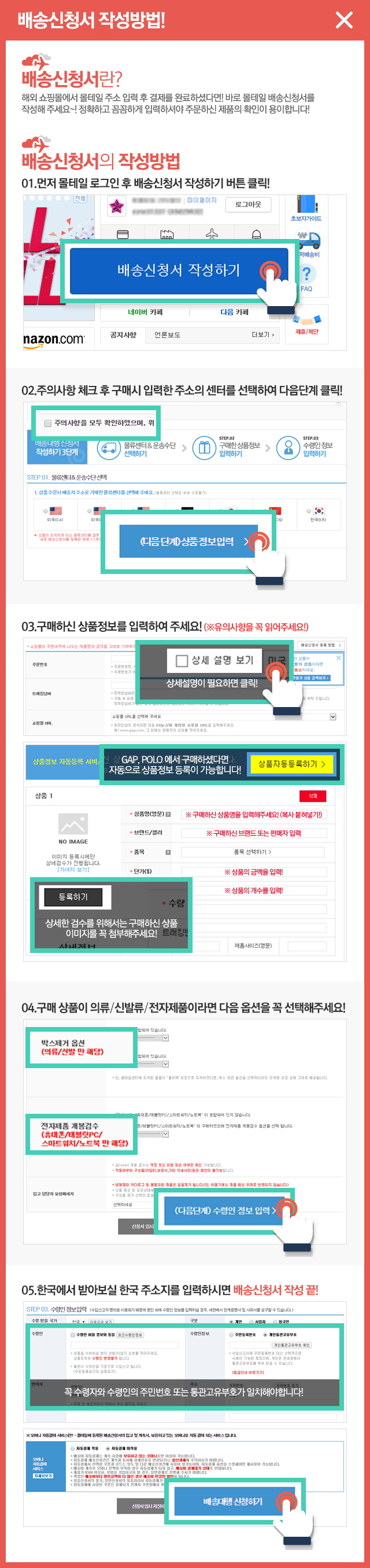 해외직구 준비물 상품 구매하기 배송신청서 작성하기 해외직구 마스터 가장 쉬운 직구방법 해외직구란? 몰테일 회원가입 구글 크롬 몰리 리워드 해외 결제 카드 개인통관 고유부호 해외직구 TOP 5 상점 구매가이드 보기 1. 아마존 2. 이베이 3. 랄프로렌 4. 갭 5. 6pm 일반 / 목록통관 수입불가 품목 핫딜게시판 네이버카페 몰스 배송신청서란? 몰테일앱 자동작성 상품정보 자동등록 이것만 꼭 알고가세요! 1대1문의 남겨주세요! 테일리스트 테일리스트 비타트라 비타트라 바이씽 바이씽 쉽겟 쉽겟 닫기 닫기 닫기 해외 쇼핑몰 구매시 주소를 어디로 입력해야할지 모르겠다면? 한국으로 배송이 안되는 물건 미리미리 확인!