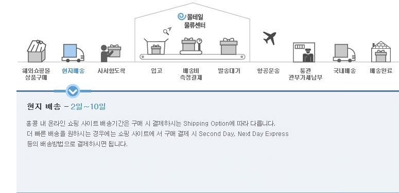 홍콩 쇼핑몰에서 온라인으로 구매하신 상품을 현지 주소지에서 대신 수령해 고객님이 계신 한국의 주소지까지 배송해드리는 서비스입니다.